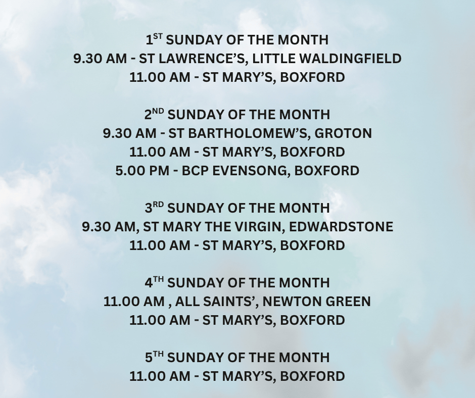 On the First Sunday of the month, the Holy Eucharist is offered at 9.30am (Little Waldingfield) and 11.00 am (Boxford)